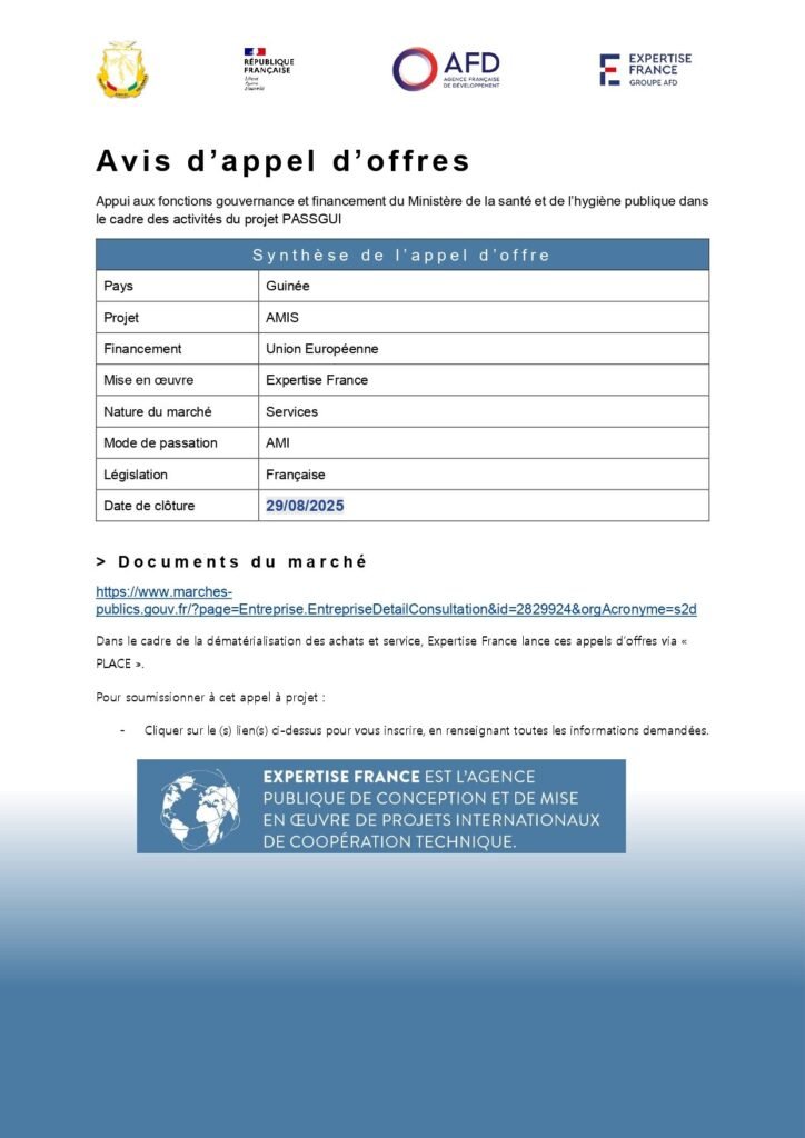 Avis d’appel d’offres pour l’Appui aux fonctions gouvernance et financement du Ministère de la santé et de l’hygiène publique dans le cadre des activités du projet PASSGUI